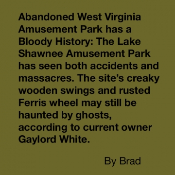 Abandoned West Virginia Amusement Park has a Bloody History - The Lake Shawnee Amusement Park has seen both accidents and massacres. The site’s creaky wooden swings and rusted Ferris wheel may still be haunted by ghosts, according to current owner Gaylord White.