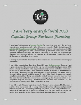 I have been looking to get a business funding for some time now, but I did not know where to go or how to go about it. After doing some research, I finally decided to go with Axis Capital Group Business Funding. The process was very quick and easy, and within minutes of applying for the loan, I was contacted by a financial search specialist. One specialist walked me through the process every step of the way and helped me get approved for the loan I needed. In addition, he has continued to work with me in finding an even better loan for my needs.