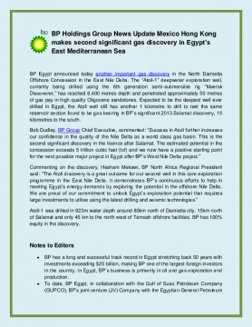 BP Egypt announced today another important gas discovery in the North Damietta Offshore Concession in the East Nile Delta. The “Atoll-1” deepwater exploration well, currently being drilled using the 6th generation semi-submersible rig “Maersk Discoverer,” has reached 6,400 metres depth and penetrated approximately 50 metres of gas pay in high quality Oligocene sandstones. Expected to be the deepest well ever drilled in Egypt, the Atoll well still has another 1 kilometre to drill to test the same reservoir section found to be gas bearing in BP’s significant 2013 Salamat discovery, 15 kilometres to the south.
