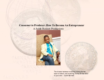 Consumer to Producer: How To Become An Entrepreneur is a based on a true story. Enclosed is a look into the life of America's very own young entrepreneur Judah Bennett. As a youngster he expresses the challenges faced and overcame in sequence to become an online entrepreneur. The book not only emphasizes the wide variety of education in order to produce an online product, but within the quotes it expresses the importance and difficulties one may be challenged with when considering the opportunity to open a storefront small business. During Bennett's altercations about the discrimination and stereotype of minor aged individuals, he discloses the significance & benefits within owning one's own company.