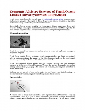 Frank Owens Limited provides a broad range of professional financial advice to entrepreneurs and business managers with respect to the most appropriate steps in acquisition, disposition and funds sourcing, based on the present market conditions.