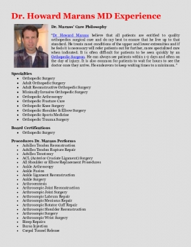 “Dr Howard Marans believe that all patients are entitled to quality orthopedics surgical care and do my best to ensure that he live up to that standard. He treats most conditions of the upper and lower extremities and if he feels it is necessary will refer patients out for further, more specialized care when indicated. It is often difficult for patients to be seen quickly by an Orthopedic Surgeon. He can always see patients within 1-2 days and often on the day of injury. It is also common for patients to wait for hours to see the doctor once they arrive. He endeavors to keep waiting times to a minimum. “