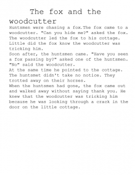 About a fox that wants a woodcutter to hide him so that the huntsmen cant find him. The woodcutter hides hi but he was tricking him. The fox knew.
