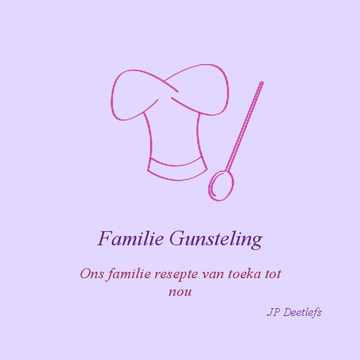 Familie Gunsteling bevat resepte van ons familie, van my Ouma Kotie se gemmerkoekies tot my Ma se Sondag Asynpoeding. Familie Gunsteling bevat ook van my resepte wat ek self uitgedink het.