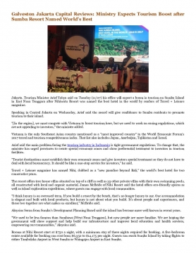 Jakarta. Tourism Minister Arief Yahya said on Tuesday (11/07) his office will expect a boom in tourism on Sumba Island in East Nusa Tenggara after Nihiwatu Resort was named the best hotel in the world by readers of Travel + Leisure magazine.