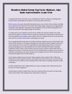IBM's Security Group has released information about a new variant of Dyre malware, initially uncovered last year, dubbed as "Dyre Wolf" that targets large companies and organizations. It basically social engineers employees into handing over their personal banking data from which the scammers will arrange a large wire transfer.