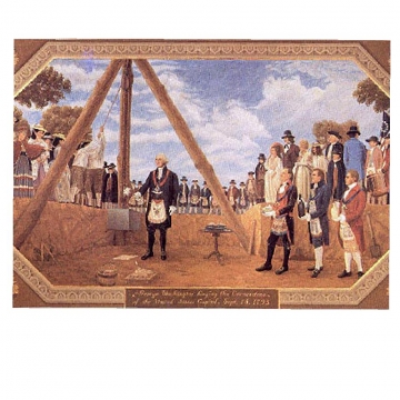 September 18, 1793, George Washington laid the U.S. Capitol cornerstone at the southeast corner of its foundation to mark the building of the nation's most symbolically important and architecturally impressive building. It was laid with great pomp and celebration. President Washington and his entourage of a company of volunteer artillery from Alexandria crossed the Potomac River and joined with Masonic Lodge members from Virginia, Maryland, and the Federal City (Washington). Together they marched with music playing, drums beating, colors flying, and spectators cheering to the Capitol site about a mile and a half away. Following the laying of the cornerstone ceremony, there was a celebratory barbeque and other activities. It was well attended and festivities took place until dark. This occasion signified the importance of this special place and what it represents to the American people then and now—the design of this building is rooted in an ideal ages old; that citizens can build..
