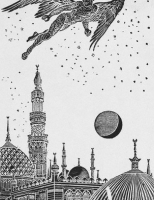 Illustration of the Devil Hovering over City.