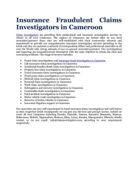 Claim Investigators are providing their professional and insurance investigation services to clients in all over Cameroon. The regions of Cameroon are looked after by our local associates/partners firms who are well-established with their trustworthy network and experienced to provide our comprehensive insurance investigation services according to the locale and also we maintain a network of correspondent offices and professional associates in all over the World with strong network of our on-ground associates/partners.
