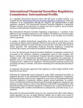 As a reputable international financial center with full access to global markets, it is essential that the International Financial Securities Regulatory Commission retains the confidence of its counterparties through the adoption and implementation of high regulatory standards. The International Financial Securities Regulatory Commission therefore attaches great importance to making sure that its policies and procedures conform to internationally accepted best practice.