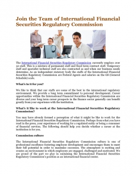 The International Financial Securities Regulatory Commission currently employs over 50 staff. This is a mixture of permanent staff and fixed term contract staff. Temporary staff and specialist technical staff are also contracted as and when our business needs determine. As an independent statutory body the staffs of the International Financial Securities Regulatory Commission are Federal Agents and salaries on the GS (General Schedule) scale.