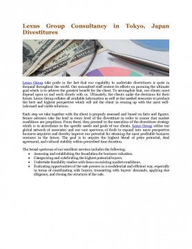 Lexus Group take pride in the fact that our capability to undertake divestitures is quite in demand throughout the world. Our committed staff centers its efforts on pursuing the ultimate goal which is to achieve the greatest benefit for the client. To accomplish that, our clients must depend upon us and work closely with us. Ultimately, the clients make the decisions for their future. Lexus Group collates all available information as well as the needed resources to produce the best and highest perspective which will aid the client in coming up with the most well-informed and viable solutions.