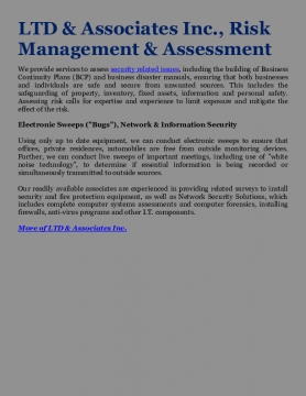 We provide services to assess security related issues, including the building of Business Continuity Plans (BCP) and business disaster manuals, ensuring that both businesses and individuals are safe and secure from unwanted sources. This includes the safeguarding of property, inventory, fixed assets, information and personal safety. Assessing risk calls for expertise and experience to limit exposure and mitigate the effect of the risk.