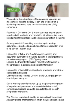 Founded in December 2012, Monmouth has already grown rapidly – both in clients and capability. Our leadership team blends industry knowledge with entrepreneurial flair, including: