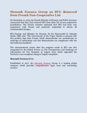 On December 21, 2015, the French Minister of Finance and Public Accounts announced that they had removed BVI from their list of non-cooperative jurisdictions. The French minister indicated that BVI had been very cooperative with France and positively responded to almost all recommended changes.