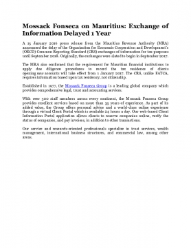 A 15 January 2016 press release from the Mauritius Revenue Authority (MRA) announced the delay of the Organization for Economic Cooperation and Development’s (OECD) Common Reporting Standard (CRS) exchanges of information for tax purposes until September 2018. Originally, the exchanges were slated to begin in September 2017.