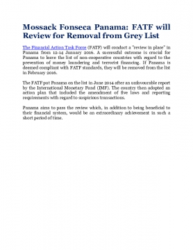 The Financial Action Task Force (FATF) will conduct a "review in place" in Panama from 12-14 January 2016. A successful outcome is crucial for Panama to leave the list of non-cooperative countries with regard to the prevention of money laundering and terrorist financing. If Panama is deemed compliant with FATF standards, they will be removed from the list in February 2016.