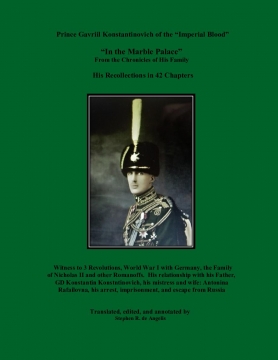 322 pages of text (English), photographs, and annotations of Gavriil Konstantinovich witnessing 3 Revolutions, and his combat involvement in World War I with Germany, the abdication of Nicholas II, and the murder of Rasputin. Especially poignant is his relationship with his father, GD Konstantin Konstantinovich ("K.R."), his life with his mistress and later wife, Antonina Rafailovna, his arrest, imprisonment, and eventual escape from Russia to Finland. There are many details of his dealings with other members of the Romanoff Family - their good and bad qualities.