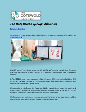 In April 2011 the company was acquired by G4S plc as G4S Investigation Solutions (UK) Ltd but we continue to trade as The Cotswold Group. The acquisition provided us with additional expertise and a global reach.