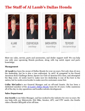 Meet our sales, service, parts and accessories, and dealer support staff. We can help you with your upcoming Honda purchase, along with top notch repair and parts knowledge.