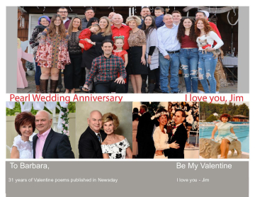 So as a Belated Valentine’s Day gift and to celebrate our 30th Pearl Wedding Anniversary, I updated my previous book containing 26 poems already published in Newsday plus one that already appeared this year. The poems and accompanying pictures celebrate milestones in our life together. The marriages of our children, births of our grand-children, and scenes from our traveling.
