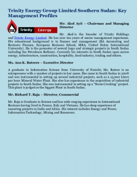 Trinity Energy Ltd (TEL) is a South Sudanese Company that was incorporated in 2012, specializing in petroleum products and related services. TEL is part of Trinity Holdings , focusing on Energy, infrastructure, Hospitality, Oil & Gas, as well as Media & advertising.